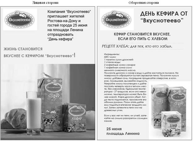 Рекламные листовки лучше сделать следующим образом: не просто сообщить о проводимом мероприятии, а снабдить статьей с каким-нибудь полезным советом (например, рецептами сдобных булочек). Такой подход будет заставлять получателей материалов не выбрасывать их, а сохранять на долгое время. Необходимо, чтобы на рекламной листовке было изображение кефира из телевизионной рекламы (для возникновения ассоциации с сюжетом ролика). Макет листовки изображен на рисунке Ж.1.