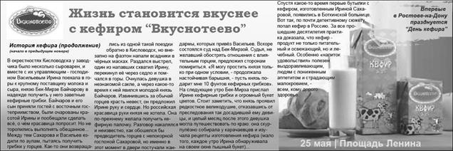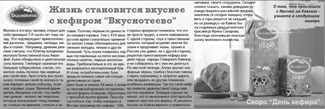 В «Комсомольской правде» следует публиковать статьи, посвященные кефиру. Например, историю напитка. Такие рекламные статьи будут восприниматься как часть редакторского материала, что сократит негатив к рекламе и увеличит вероятность прочтения. Обязательно следует указать в статье о проведении мероприятия-концерта и изобразить продукт. Желательно разместить две разные статьи в разных выпусках (каждую неделю – разные материалы). Так у читателя не возникнет ощущение повторяемости. Макет объявления на 1/4 полосы представлен на Рисунке К.1.