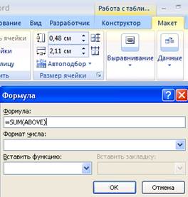 5. в диалоговом окне указать функцию (SUM, MAX, MIN, COUNT) и параметр, определяющий место расположение чисел (LEFT, RIGHT, ABOVE, BELLOW). При изменении чисел будет меняться результат вычислений.