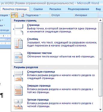 Если текст состоит из страниц, имеющие разные параметры, то его нужно разделить на разделы. Страница имеет следующие параметры: