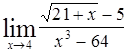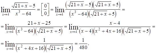 Имеем неопределенность вида . Для ее раскрытия умножим числитель и знаменатель на выражение сопряженное числителю, разложим выражение стоящее в знаменателе на множители по формуле разности кубов и сократим числитель и знаменатель на общий множитель , который при не равен нулю. В результате неопределенность будет раскрыта.