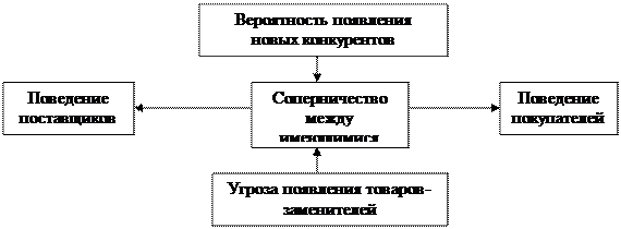 Поскольку конкурентная среда формируется не только под влиянием борьбы внутриотраслевых конкурентов, для анализа конкуренции на рынке в соответствии с моделью М.Портера учитываются следующие группы факторов: соперничество среди конкурирующих на данном рынке продавцов («центральный ринг») – ситуация в отрасли; конкуренция со стороны товаров, являющихся заменителями – влияние товаров-заменителей; угроза появления новых конкурентов – влияние потенциальных конкурентов; позиции поставщиков, их экономические возможности – влияние поставщиков; позиции потребителей, их экономические возможности – влияние покупателей. [6, с.83]