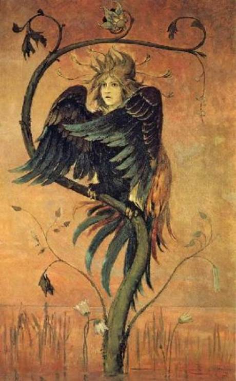 Черноперый Алконост, сидящий на "ветвистом троне", тоже пророчествует о будущем, но о печальном и трагическом. Другая — вся печалью мощной Истощена, изнурена... Тоской вседневной и всенощной Вся грудь высокая полна... Напев звучит глубоким стоном, В груди рыданье залегло, И над ее ветвистым троном Нависло черное крыло... Вдали — багровые зарницы, Небес померкла бирюза... И с окровавленной ресницы Катится тяжкая слеза...