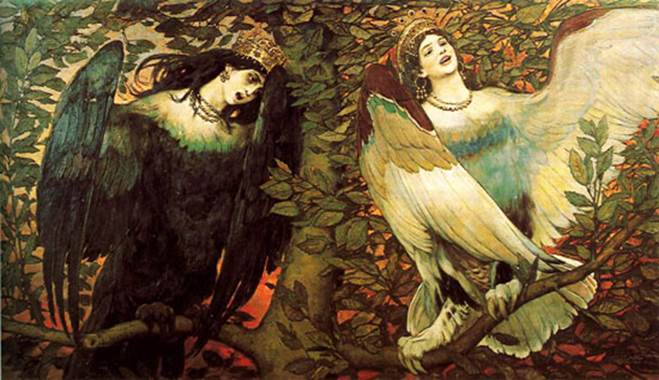 История этих образов уходит в глубокую старину. В народном, преимущественно старообрядческом творчестве античные Сирена и Алкиона превратились в "птиц с ликом девы". Вылетая из райского сада, они поют о будущей жизни. Тот, кто слышит эти песни, не в силах оторваться, и идет за ними ,пока не умрет от усталости. Поэтому на народных картинках изображается, как Сирина и Алконоста отгоняют выстрелами из пушек. Этот многосложный образ, соединяющий в себе жизнь и смерть, привлек чрезвычайный интерес художников и литераторов именно в эпоху символизма. Васнецов придал индивидуальность этим парным образам и придумал легенду о светлой и темной прорицательницах.