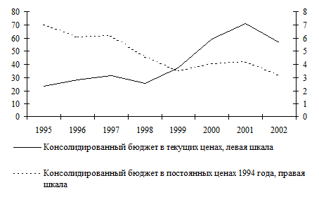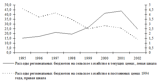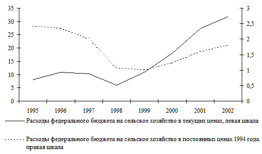 Бюджетные расходы на аграрный сектор являются отражением федеральной и региональной аграрной политики. На протяжении переходного периода объем бюджетных ассигнований на сельское хозяйство постоянно снижался. Так, в 1992 году доля расходов на сельское хозяйство в общих расходах консолидированного бюджета составляла более 13%, а к 2002 году их доля уменьшилась до 1,8% и продолжает снижаться. (Таблица 1). Доля бюджетных ассигнований на сельское хозяйство в процентах к ВВП снизилась с 4,5% в 1992 году до 0,5% в 2002 году. При этом объем бюджетных ассигнований, приходящийся на одного занятого и на один гектар посевов, существенно увеличивавшийся после кризиса 1998 года, в 2002 году вновь упал. Расходы на сельское хозяйство в постоянных ценах упали более чем в 2 раза на протяжении рассматриваемого периода. (Рисунок 1).