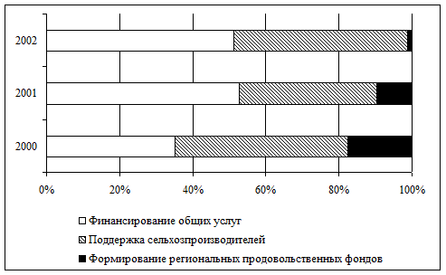 В 2002 г. в связи с общей тенденцией к централизации бюджетных расходов на поддержку АПК, а также в связи с передачей на федеральных уровень части бюджетных расходов, в частности, содержания бюджетных организаций АПК произошло некоторое увеличение расходов на аграрный сектор в пользу федерального бюджета.