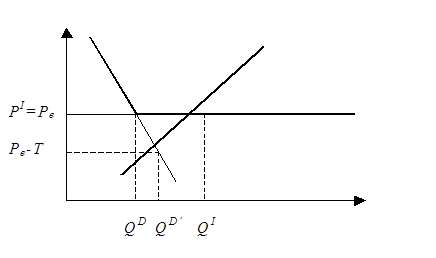 Безусловно, Россия крупный экспортер, и для нее спрос мирового рынка, вообще говоря, нельзя рассматривать абсолютно эластичным. Однако очевидно, что спрос внешний существенно более эластичен, чем спрос внутренний. Поэтому горизонтальное изображение внешнего спроса на нашем рисунке можно считать не сильным допущением, которое, тем не менее, заметно повышает наглядность представления