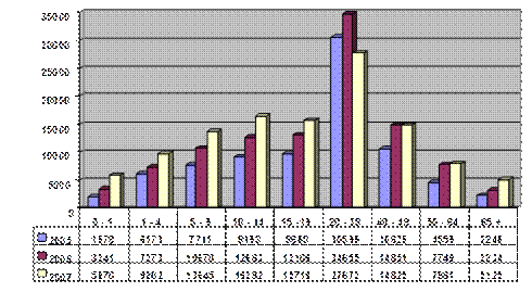 [127] Из этого общего числа на детей в возрасте 3−5 лет приходится 861 213, или 10,5% (в городской местности это равняется 60,6% мальчиков и девочек, в сельской − 33,4%); возраст 3 143 247 человек, т.е. 38,5%, составляет 6−11 лет, возраст 2 572 208 человек, т.е. 31,5%, составляет 12−16 лет и, наконец, на группу в возрасте 17−24 лет приходится 1 592 568 человек, или 19,5%.