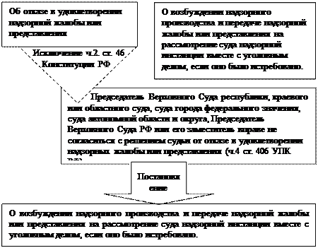 3. Другое различие заключается в том, что в кассационном порядке судебное решение может быть пересмотрено только один раз, а в порядке судебного надзора — неоднократно, поскольку судебно-надзорных инстанций несколько и одна (вышестоящая) обладает правом пересмотра решений другой (нижестоящей). Судебно-надзорное производство является, таким образом, важным средством исправления ошибок, допущенных не только при рассмотрении уголовного дела в суде первой инстанции, но и при пересмотре его в кассационной или нижестоящей судебно-надзорной инстанции. И наконец, кассационная жалоба или представление влекут за собой обязательное рассмотрение дела в суде кассационной инстанции, тогда как судебно-надзорное производство возбуждается только при наличии усмотрения должностных лиц судебных или прокурорских органов.