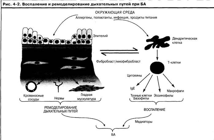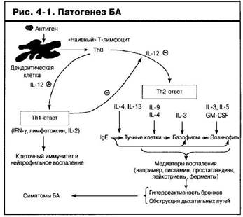 В настоящее время широко распространено мнение, что Т-лимфоциты играют основополагающую роль в управлении процессом воспаления дыхательных путей посредством их способности генерировать широкий спектр цитокинов, закодированных в генном кластере IL-4 на длинном плече хромосомы 5. Дополнительные цитокины, выделенные из тучных клеток и эозинофилов, также играют ключевые роли, особенно TNF-a, который ответственен за инициирование нарушения функции молекул адгезии, вовлеченных в пополнение эозинофилов и других воспалительных клеток из крови. Признана также значимость хемокинов СХС и СС в качестве местных хемоаттрактантов и активирующих стимулов. Время покажет, какое значение будут иметь знания об этих факторах с точки зрения клинического применения при лечении БА.