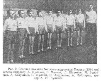 Однако, занимаясь вместе со взрослыми, юноши оказывались в трудных условиях. И оставаться в секциях, продолжать успешно заниматься могли лишь самые упорные, самые сильные. Это был первый этап развития юношеского бокса.
