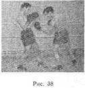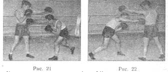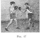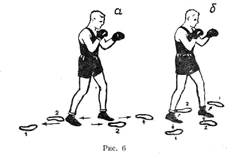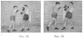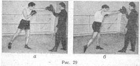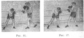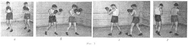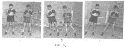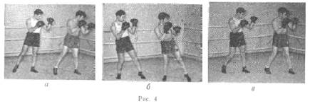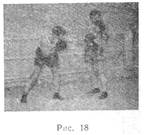 2) в начальной стадии обучения следует воздерживаться от ударов правой рукой. Правая рука в основном должна выполнять в этой стадии защитные функции. Это необходимо потому, что юноши-новички, увлекаясь ударами, зачастую забывают о защите, в то время как они в первую очередь должны научиться четко и экономно защищаться.