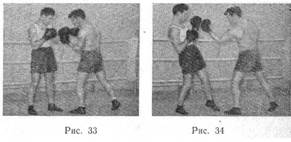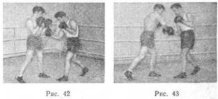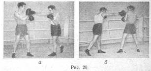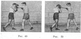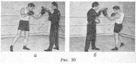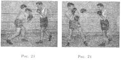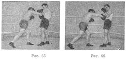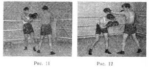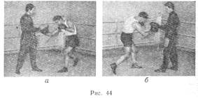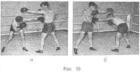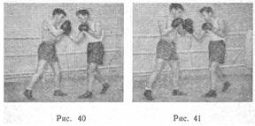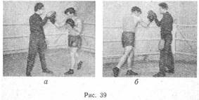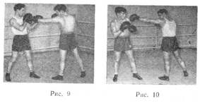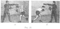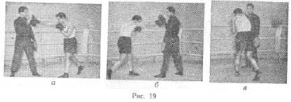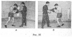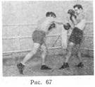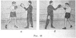 Большое место в занятиях с юношами должен занимать показ. Показывать каждый новый прием следует не меньше 3—4 раз, причем каждый — в разных позициях, так, чтобы ученики видели движение и спереди, и сбоку, и сзади. Показ нужно сопровождать краткими объяснениями, в которых обращается внимание юношей на основное, главное. Например, объясняя удар снизу левой, следует обратить внимание на рывок левым бедром, на правильное движение кулака, локтя, на положение правой руки.
