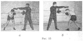 Необходимо также учитывать, что каждый новичок стремится возможно быстрее стать боксером. Поэтому (вопреки мнению некоторых тренеров) с самого начала обучения необходимо давать учащимся перчатки и предлагать занимающимся один-два раунда условного боя (конечно, со строго ограниченными техническими средствами, небольшой физиологической нагрузкой). Для этого, естественно, следует подбирать партнеров, равных по весу, возрасту и физической подготовленности.