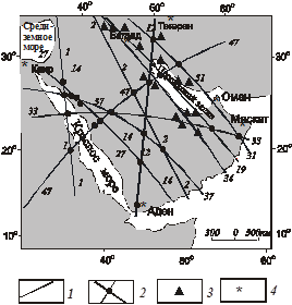 Рис. 1. Схема распределения рифтогенных узлов на Аравийском полуострове. 1 – палеомагнитные экваторы и их цифровая (возрастная) индексация (см. в тексте), 2 – рифтогенные узлы, 3 – нефтегазоносные районы, 4 – населенные пункты.