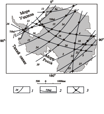 Опираясь на опыт изучения эталонного Полтавского рифтогенного узла, где располагается наибольшее число месторождений Днепровско-Донецкой углеводородной провинции Украины относимых к эндогенному классу (Нефтегазоперспективные объекты …, 2002), представляется необходимым акцентировать внимание в этом же направлении также и на Антарктическом континенте. Его территорию пересекают 18 палеомагнитных экваторов во временном интервале от архея до среднего палеозоя. При их взаимном пересечении были сформированы 37 рифтогенных узлов, которые в сумме могут претендовать на потенциально углеводородный регион в северо-восточной половине этого древнего материка (рис. 2).
