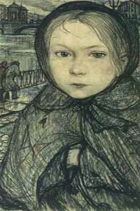 Четвертой была чуть позже сделанная работа одному из самых любимых его пронзительных творений Достоевского – “Неточка Незванова”. В темноте петербургской комнаты трепетно горит свеча. Маленькая девочка с ужасом ощущает близость мертвого тела. Ребенок и смерть... Работая над этим образом, он вспоминал дни ленинградской блокады, ледяную квартиру и все то, что ему довелось пережить самому, будучи почти сверстником Неточки Незвановой.