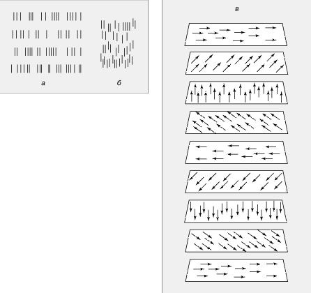 , схема молекулярной упаковки. В смектическом классе (за исключением смектика D) молекулы расположены в слоях. Каждая молекула остается в своем слое, но слои могут скользить один относительно другого. В нематических жидких кристаллах молекулы могут двигаться во всех направлениях, но их оси всегда остаются параллельными друг другу. В холестерически-нематических жидких кристаллах оси молекул лежат в плоскости слоя, но их ориентация меняется от слоя к слою как бы спирали. Благодаря такой спиральной закрутке тонкие пленки холестерических жидких кристаллов обладают необычайно высокой способностью к вращению плоскости поляризации поляризованного света. а