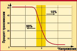 "А как насчет градаций серого?" - спросите вы. Градациями, или уровнями яркости пикселов, можно управлять с помощью величины приложенного напряжения. Постепенно повышая его, мы будем наблюдать, как молекулярная спираль проходит через три этапа своего состояния - три зоны (рисунок 5). Зона 1 соответствует максимуму пропускания и белому цвету (максимальному повороту поляризации), зона 3 - минимуму и черному цвету, а самые интересные состояния находятся в зоне 2. При прецизионном изменении напряжения в ее пределах получаются все оттенки серого.
