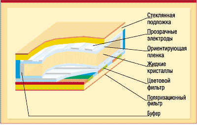 Свет направляется на поляризационный фильтр. Далее следует стеклянная пластина, на которую нанесены полупрозрачные электроды из пленки окислов индия и олова, формирующие пикселы изображения. Затем идет полимерная пленка с микробороздками, ориентирующими молекулы жидких кристаллов, составляющие следующий слой. Вторая половина - все с точностью до наоборот (за исключением подсветки).