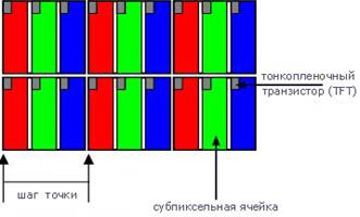 ransistor). Цветные фильтры дают возможность ячейкам менять свои естественные цвета RGB. Точки явственно различимы, при этом чем меньше расстояние между ними, тем больше максимально возможное разрешение. Однако TFT также имеют физическое ограничение, которое определяется максимальной площадью экрана.