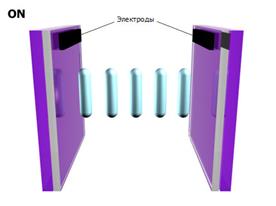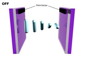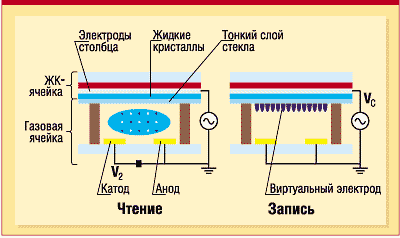 В этом типе дисплеев используется плазменная панель для управления ЖК-ячейками. PALC-дисплей состоит из стеклянной подложки, с нижней стороны которой нанесен поляризационный фильтр, а с верхней -- сформированы продольные выступы-барьеры. Внутри каждой колонки, образованной барьерами, расположены два электрода. Сверху конструкцию накрывают тонким слоем стекла и полученные емкости наполняют газом под давлением несколько кПа. Затем следуют слой ЖК, прозрачная пленка с электродами колонок, цветные фильтры, субстрат стекла с поляризатором (Рисунок 12). Позади всей конструкции располагается блок подсветки. Выборка колонки осуществляется путем генерации разряда между двумя электродами в наполненной разреженным газом продольной ячейке. На поверхности стекла, разделяющего газовую и ЖК-ячейки, формируется отрицательный заряд, представляющий собой как бы виртуальный электрод (Рисунок 13). На один из поперечных электродов с противоположной стороны "сандвича" подается напряжение +70 В. Заряд с виртуального электрода протекает через ЖК-ячейку, расположенную на пересечении газовой продольной ячейки и поперечного электрода. Как только заряд стечет, все ЖК-ячейки переходят в полностью изолированное состояние, и можно начинать выборку следующего пиксела.