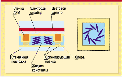 Специалисты Sharp реализовали другую технологию расширения угла обзора -- ASM (Axially Symmetric aligned micro-cell Mode). На цветном фильтре формируются специальные выступающие стенки, покрытые ориентирующей полимерной пленкой (Рисунок 11). Они образуют индивидуальные ЖК-ячейки с необычным аксиально-симметричным расположением молекул кристалла (наподобие лопастей вентилятора). Стенки, ограничивающие ЖК-ячейки, получаются в результате внедрения в состав кристалла молекул полимеризованной смолы и облучения полученной смеси ультрафиолетовым излучением после фазового разделения. ASM относится к классу методик стабилизации ЖК с помощью полимеров. Согласно другому методу использования полимеров, их в небольшом количестве домешивают к жидким кристаллам, что позволяет контролировать ориентацию молекул ЖК непосредственно внутри ячейки, а не только на двух граничных поверхностях, как это происходит в случае полимерных пленок.