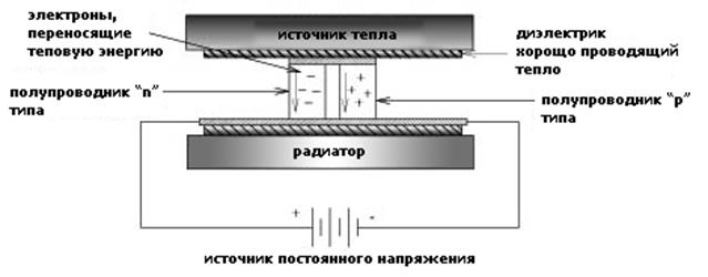 В первой половине 19-го века французским ученым Пельтье был открыт эффект заключающийся в том, что напряжение, поданное на два противоположных друг другу по проводимости материала вызывает разницу температур. В зоне поглощения тепла (охлаждаемый объект) электроны переходят в более высокое энергетическое состояние, поглощая тепловую энергию. Перетекая в зону с низким энергетическим состоянием, электроны отдают тепло (радиатор). Типовой термоэлектрический модуль, таким образом, состоит из нескольких десятков (сотен), так называемых термопар, образованных полупроводниками различной проводимости p