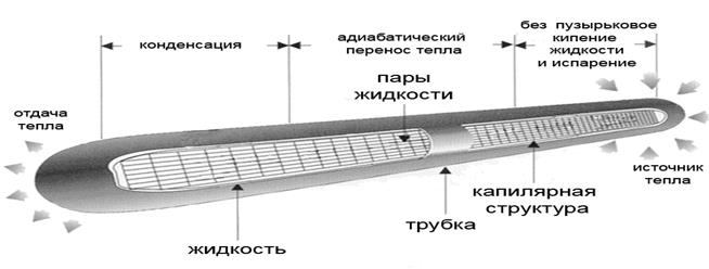 . К зоне испарения подводится тепло, жидкость, находящаяся в трубке начинает кипеть и интенсивно испаряться. Крайне важно, чтобы кипение было без пузырьков. Горячие пары жидкости поднимаются в зону конденсации, где остывают, и превращается обратно в жидкость, которая возвращается обратно в зону испарения по специальной капиллярной структуре. Капиллярная структура представляет собой кривые прецизионные канавки в меди глубиной 60 мкм.