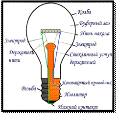 Принцип действия ламп накаливания основан на преобразовании электрической энергии, проходящей через нить, в световую. В лампах накаливания вольфрамовая нить под действием электрического тока раскаляется до яркого свечения. Температура разогретой нити достигает 2600-3000 градусов С. Колбы ламп накаливания вакуумируются или заполняются инертным газом, в среде которого вольфрамовая нить накала не окисляется: азотом; аргоном; криптоном; смесью азота, аргона, ксенона. Лампы накаливания сильно греются в процессе эксплуатации.