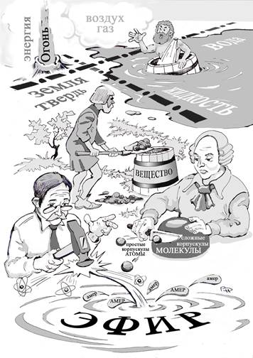 Из указанных трех тел на роль мировой среды подходит лишь газ. Твердое тело не годится, так как трудно объяснить, каким образом сквозь него могут протискиваться планеты, практически не изменяя скорости. Жидкое тело тоже мало подходит, так как жидкость, обладая поверхностным натяжением, должна в невесомости собираться в шары. А это значит, что тогда в пространстве будут наблюдаться неравномерности при прохождении света, но этого не наблюдается. И только газ удовлетворяет всем требованиям, предъявляемым к мировой среде: он естественным образом заполняет все пространство, имеет малую вязкость и способен в широких пределах изменять свою плотность, что немаловажно при образовании частиц вещества.