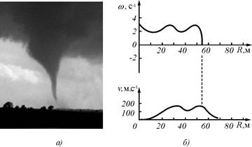 Винтовое движение газа в вихревом столбе более устойчиво, чем не винтовое, так как градиент скорости в пограничном слое увеличивается – добавляется еще одно перемещение газа вдоль столба. Поэтому смерчи наиболее устойчивы тогда, когда в них сочетаются два движения – вращательное вокруг оси и поступательное вдоль оси вихря (рис. 5.7).
