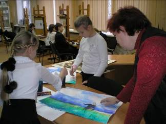 Непременным условием работы с детьми по изобразительному искусству является присутствие детских работ в образовательной среде кабинета, в рамах на стене, в учебных витринах, в паспарту на учебной доске. Дети видят свои работы и рисунки своих сверстников. Это позволяет обеспечить единство учебно-воспитательного процесса, стимулирует ученика к саморазвитию и самосовершенствованию.