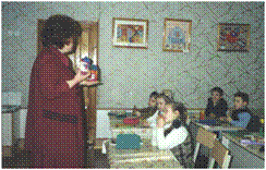Учитель свободно передвигаясь по кабинету, внимательно наблюдает за детьми, помогает им советами, показывает образцы своих действий, направляет творческую деятельность детей. В кабинете много деталей положительно воздействующих на эмоциональное состояние участников образовательного процесса : очень часто на уроках звучит музыка, настраивая детей на творчество. Иногда это «бурное море», а иногда просто пение птиц и журчание воды.