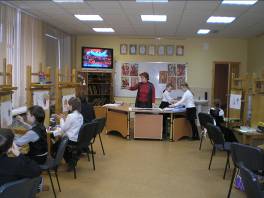 Говорят, что воспитывают даже стены. В сером и скучном кабинете нельзя вести уроки искусства. Атмосфера урока – это и атмосфера кабинета. Светлые, теплого цвета, стены настраивают учащихся на восприятие прекрасного. Важным условием работы является небольшая численность детей- не более 16-18 человек (половина класса в другом кабинете). Это позволяет на деле осуществлять индивидуальный подход и работать с детьми в оптимальном для них режиме. При таком подходе ученики в большей степени личностно вовлекаются в учебно-воспитательный процесс.