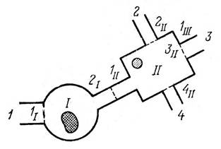 Метод минимальных автономных блоков (МАБ) был развит Никольским [13]. Изложение этого метода стоит начать наиболее прозрачным примером. На рис. 1 приведена схема электродинамической системы типа волноводного устройства. Это соединение полых металлических объектов I