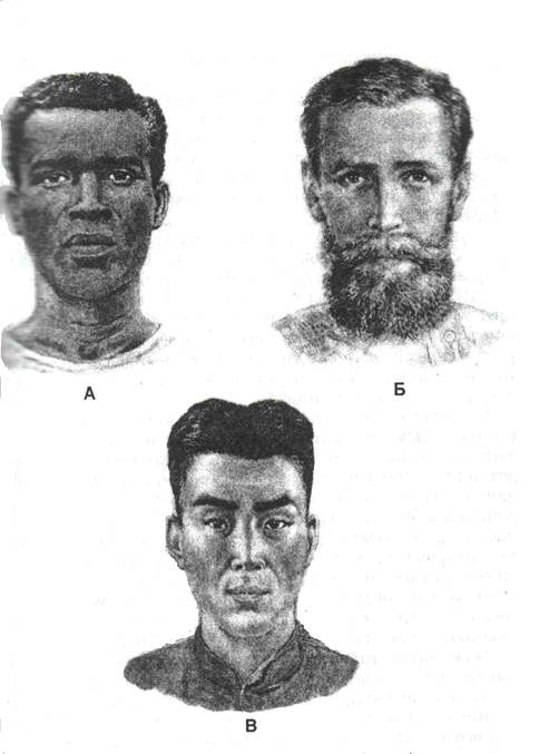 Большие человеческие расы: А- экваториальная (австрало-негроидная); Б- евразийская (европеоидная); В – азиатско-американская (монголоидная)