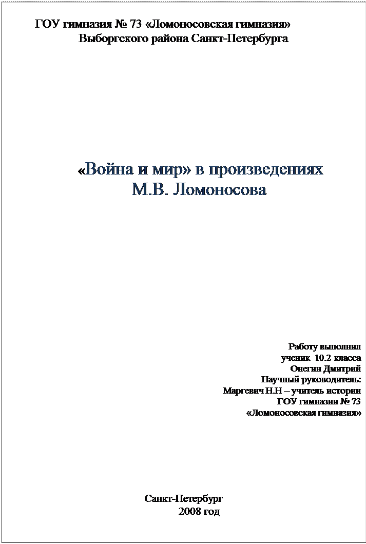 , их трактовка подкреплена конкретными примерами из его произведений. Проблема мира, как и проблема войны, привлекает внимание политических и общественных движений, ученых многих стран и сегодня. Бесспорны успехи миролюбивых сил и всех организаций, как и достижения ряда школ и направлений, научных центров, специализирующихся на исследовании проблем мира. Накоплена обширная сумма знаний о мире как цели, как факторе развития и выживания человечества, о сложной диалектике взаимосвязи войны и мира и ее особенностях в современную эпоху, о возможных путях и предпосылках продвижения к миру без оружия и войн – и в этом, бесспорно, велика роль ученого и поэта, Михаила Васильевича Ломоносова.