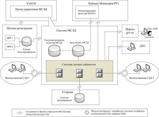 В процесс создания межведомственной СЭД должны быть вовлечены заинтересованные государственные органы: Олий Мажлис, Кабинет Министров, Узбекское агентство связи и информатизации, Служба национальной безопасности, Министерство юстиции, Агентство «Узстандарт», Агентство «Узархив», а также Центры регистрации ключей ЭЦП, отечественные разработчики и поставщики информационных технологий и систем электронного документооборота.