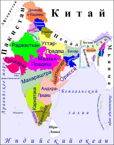 Индия является федеративной республикой, состоящей из двадцати восьми штатов, шести союзных территорий и Национального столичного округа Дели. Все штаты, и две союзные территории, — Пудучерри и Национальный столичный округ Дели — имеют собственное избираемое правительство. Остальные пять союзных территорий управляются администратором, назначаемым центральной властью, и следовательно находятся под прямым управлением президента Индии.