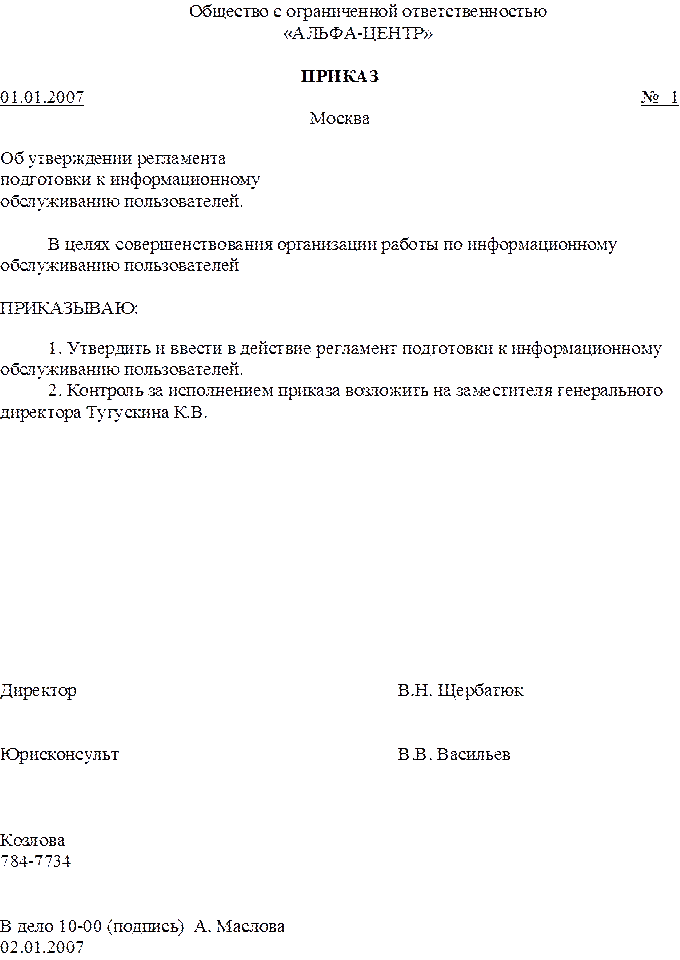 Настоящей доверенностью, ООО «АЛЬФА-ЦЕНТР» в лице генерального директора В.Н. Щербатюк, доверяет юрисконсульту В.В. Васильеву представлять интересы предприятия во всех государственных учреждениях и организациях, совершать все необходимые действия в интересах предприятия.