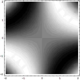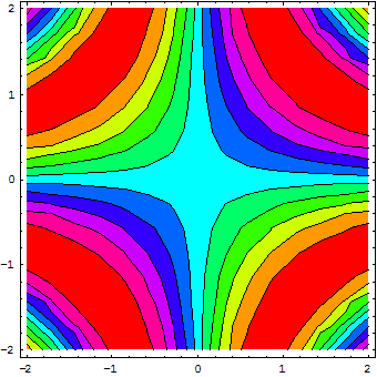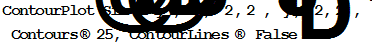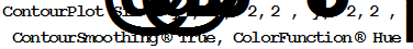 Рисунок 6 показывает построение контурного графика с окраской промежуточных областей между линиями. Окраска обеспечивается опцией ColorFunction-> Hue. Опция ContourSmoothing->True задает сглаживание контурных линий.