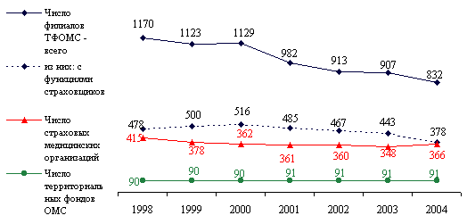 На 1 января 2005 года структура системы обязательного медицинского страхования была представлена 91 территориальным фондом ОМС, 832 их филиалами, из которых 378 филиалов выполняли функции страховщиков, 276 страховыми медицинскими организациями и 90 их филиалами (всего 366, включая филиалы СМО) (таблица 2).