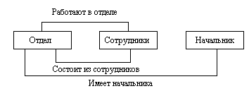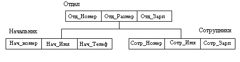 Здесь Отдел является предком для Начальника и Сотрудники, а Начальник и Сотрудники – потомки отдела. Между типами записи поддерживаются связи. Никакой потомок не может существовать без своего родителя, причем предок должен быть один.