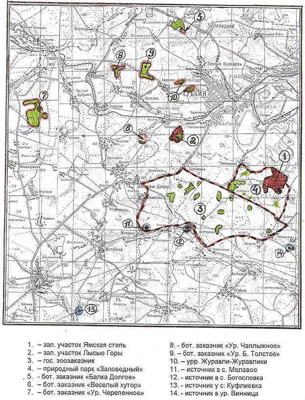 На территории г. Губкина и Губкинского района в 2002 году была завершена работа по инвентаризации особо охраняемых природных территорий. Принято соответствующее постановление главы местного г. Губкина и Губкинского района от 20.11.2002 года №1458 «О создании сети особо охраняемых природных территорий г. Губкине и Губкинском районе» (прилагается). На нашей территории расположены два заповедных участка «Ямская степь» и «Лысые горы», которые входят в состав государственного природного заповедника «Белогорье». Участок «Ямская степь» (образован в 1935 г.) площадью 566 га расположен в 12 км к юго-западу от г. Губкин. Участок «Лысые Горы» (образован в 1993 г.) расположен в З км на юго-запад от г. Губкин (площадь его составляет 170 га), и верховьях одного и правых притоков р. Оскол. Суммарная площадь этих ценнейших участков составляет 736 га. На территориях данных участков сохранились остатки луговых степей. Реликтовая растительность меловых обнажений, сохранившаяся с прошедших геологических эпох. Многие виды растений занесены в Красную книгу России и являются эндемиками региона.