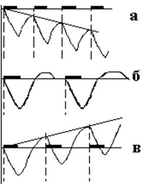 Рис. 4. Тренировочный эффект (черным выделены моменты тренировок). а) - слишком частые тренировки, истощение и перетренированность, б) - слишком редкие тренировки, никакого существенного эффекта, в) - правильный тренировки в момент суперкомпенсации, рост силы и мышечной массы.