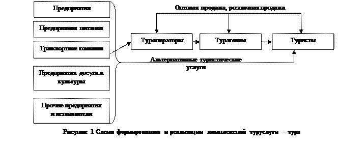 Туризм является открытой системой, на которую оказывают существенное влияние природные факторы, климатические, экономические и социальные катаклизмы, национальные и региональные конфликты и т.п. Некоторые из этих внешних воздействий на систему проявляются регулярно, появление других предсказать невозможно. Ситуация осложняется и тем, что во многих случаях некоторые виды коммерческой деятельности, например транспортная, организация размещения и питания, направлены на обслуживание не только организованных туристов, но и обычных клиентов. Кроме того, не все туристы пользуются услугами, предлагаемыми туроператорами или турагентами, предпочитая действовать напрямую, самостоятельно связываясь с транспортными компаниями и гостиницами. Другие потребители туристских услуг предпочитают иметь дело не с турагентами, а непосредственно с операторами туров. Схема формирования и продажи комплексной туристской услуги-тура представлена на Рисунок 1. Здесь в качестве контрагентов и исполнителей отдельных услуг, входящих в турпакет, представлены: гостиницы, рестораны, транспортные компании-перевозчики, предприятия культуры (парки, музеи, театры), спорта (клубы, стадионы), лечебно-оздоровительные заведения и экскурсионные предприятия. Они выступают в качестве внутренних и иностранных контрагентов и исполнителей услуг, поставляющих отдельные услуги туроператорам для формирования тура (турпакета).