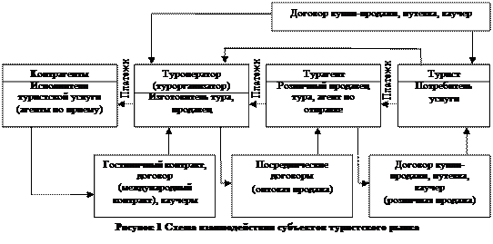 В практике туристской деятельности различаются туроператоры и тура-генты, работающие на прием туристов или их отправку. Прием и отправка могут осуществляться по отношению как к внутренним, так и к международным туристам. При проведении путешествий и экскурсий возникает потребность в услугах руководителя группы (турменеджера), экскурсовода или гида-переводчика. Под их услугами понимается деятельность профессионально подготовленного физического лица по ознакомлению туристов в ходе проведения путешествия, поездки, экскурсии с туристскими ресурсами в стране (месте) пребывания. К туристским ресурсам относятся природные, исторические, социально-культурные объекты (природные парки, заповедники, архитектурные сооружения и ансамбли, памятники истории и культуры, театры, музеи, спортивные сооружения и др.), способные удовлетворить духовные потребности туристов, содействовать восстановлению и укреплению их физических сил. Таким образом, в разработке, предоставлении и потреблении туристских услуг участвуют следующие субъекты: турист (покупатель); розничный продавец - турагент; оптовый продавец и изготовитель (организатор) тура - туроператор, а также контрагенты туроператора - предприятия и компании, предоставляющие и исполняющие отдельные услуги по размещению, питанию, транспортные, экскурсионные, страховые, услуги, связанные с оформлением заграничных паспортов и виз, бронированием и покупкой билетов, и другие, входящие в состав тура. Допускается совмещение одним субъектом, осуществляющим разработку, исполнение и предоставление туристских услуг, нескольких из перечисленных выше функций. Продавцы и контрагенты несут перед туристом ответстьенность за качество и безопасность предоставляемых ими туристских услуг. Схема взаимодействия субъектов туристского рынка представлена на Рисунок 3.