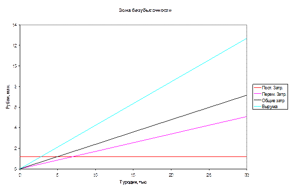 Наглядно определение зоны безубыточности и порога рентабельности функционирования предприятия проводится графическим методом, который основывается на учёте себестоимости продукции по переменным и постоянным затратам.