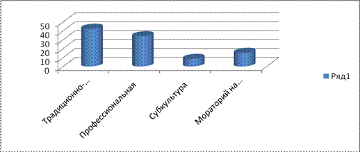 Исследование показало, что у испытуемых данной группы наиболее выражены такие виды социальной идентичности как традиционно-семейная и профессиональная. 42% школьников отождествляют себя с семейной ролью, образом родителей: «мирная семья и любовь», «выйти замуж за любимого человека», «хочу жить с большой семьей, умереть в старости в окружении близких людей». 34% испытуемых обнаружили профессиональную идентичность («хочу быть достаточно востребованным фотографом», «поступить в медицинский институт, стать хорошим врачом», «найти хорошооплачиваемую работу», «создать успешную карьеру», «большие проекты и планы на работу»). Наше исследование подтвердило вывод отечественных психологов о том, что идеальный образ профессионала заменяется на идеальный образ жизни («стать успешным, обеспеченным карьеристом»). Таким образом, неопределённость ценностных представлений о самой профессии смещает ориентиры на выбор предпочитаемого, желаемого образа жизни с помощью професии, которая уже выступает средством его достижения, а не его существенной частью. Если раньше идеальный образ профессионала во многом был связан с людьми, достигшими больших успехов в профессиональной деятельности, то современные школьники идентифицируют себя с людьми, достигшими высокого социального статуса (Лужков, Мерилин Монро, Путин и т.д.). 15% старших школьников обнаружили мораторий на социальную идентичность, объясняя это желанием не быть похожим на других, отсутствием идеалов и кумиров, потребностью «завоевать мир». Менее всего (8%) старшие школьники идентифицируют себя с какой-либо субкультурой («член группировки MASAD, футбольный фанат, рокер и др.).